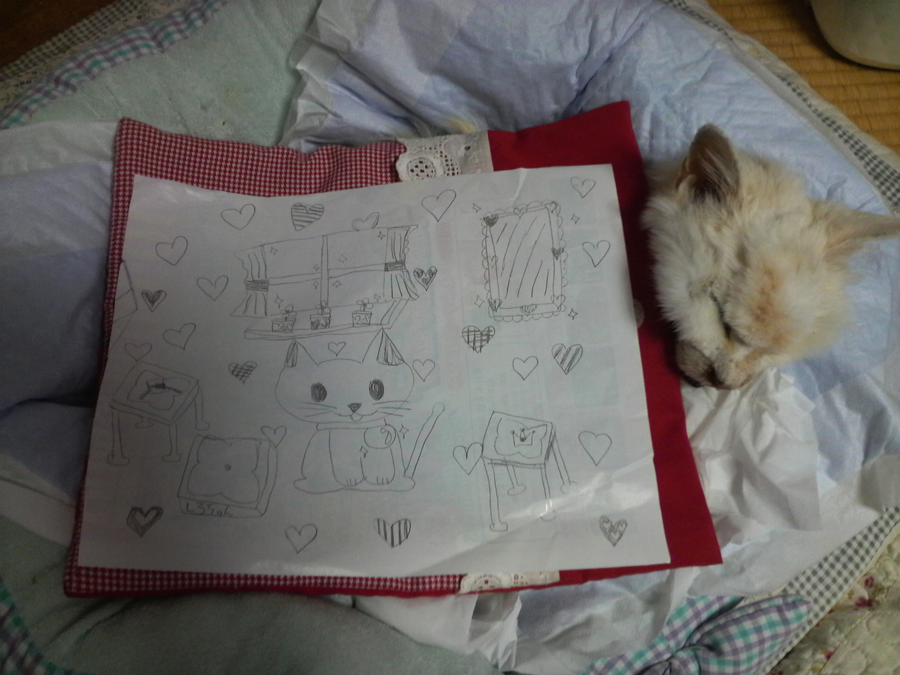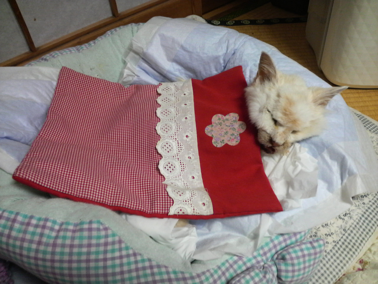 赤い掛け布団は、シロちゃんが