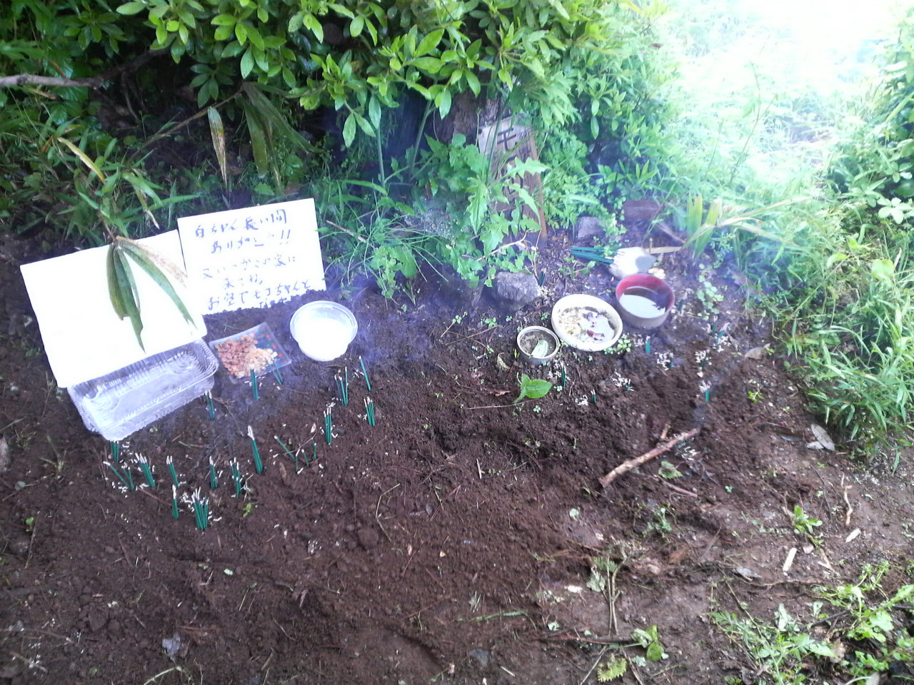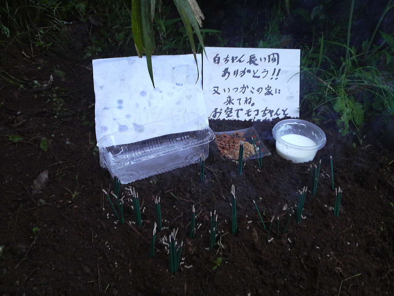 土をかけ終わって水と牛乳とエサをあげて一人ずつお線香をあげました。