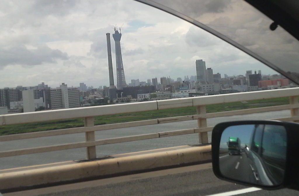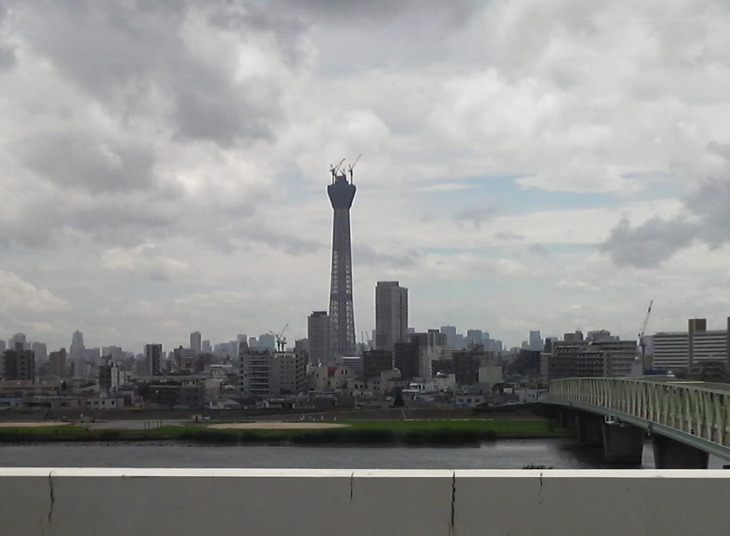 右の写真は、ちょっと面白く煙突と並んだスカイツリーです。