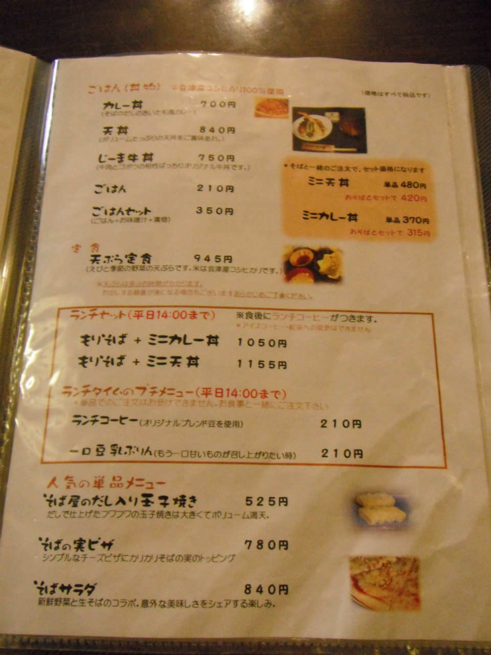 その中から、「もりそばとミニ天丼のランチセット」をチョイスしました。(コーヒー付)