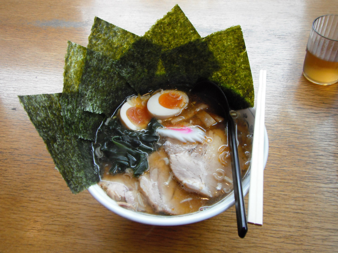 のりで覆われて、チャーシューも柔らかく、スープは魚介ととんこつベースの