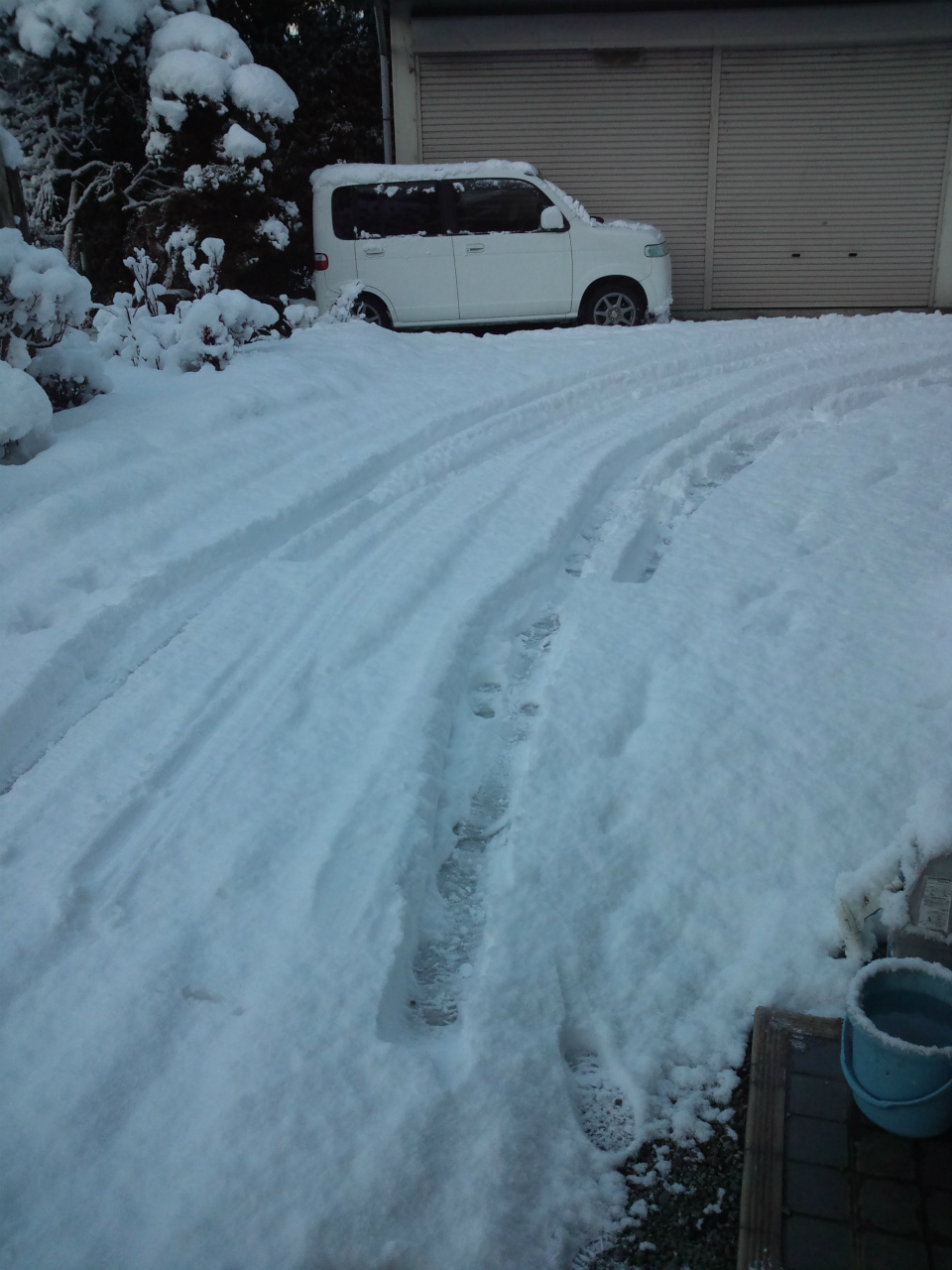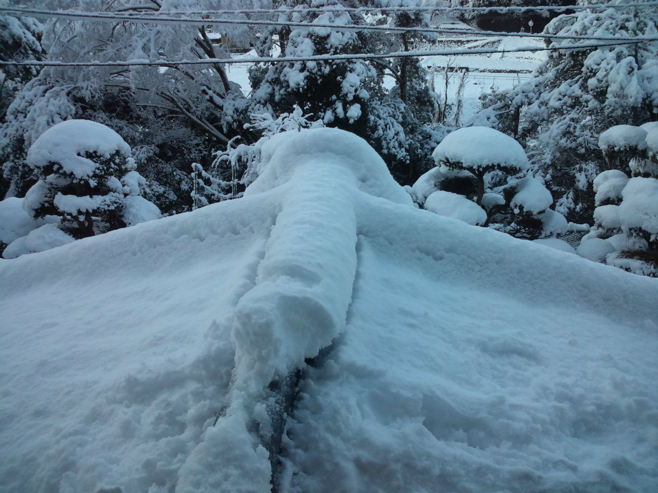 2階の屋根です。20cmくらい積もっています。右は庭で奥に我が通勤車が!