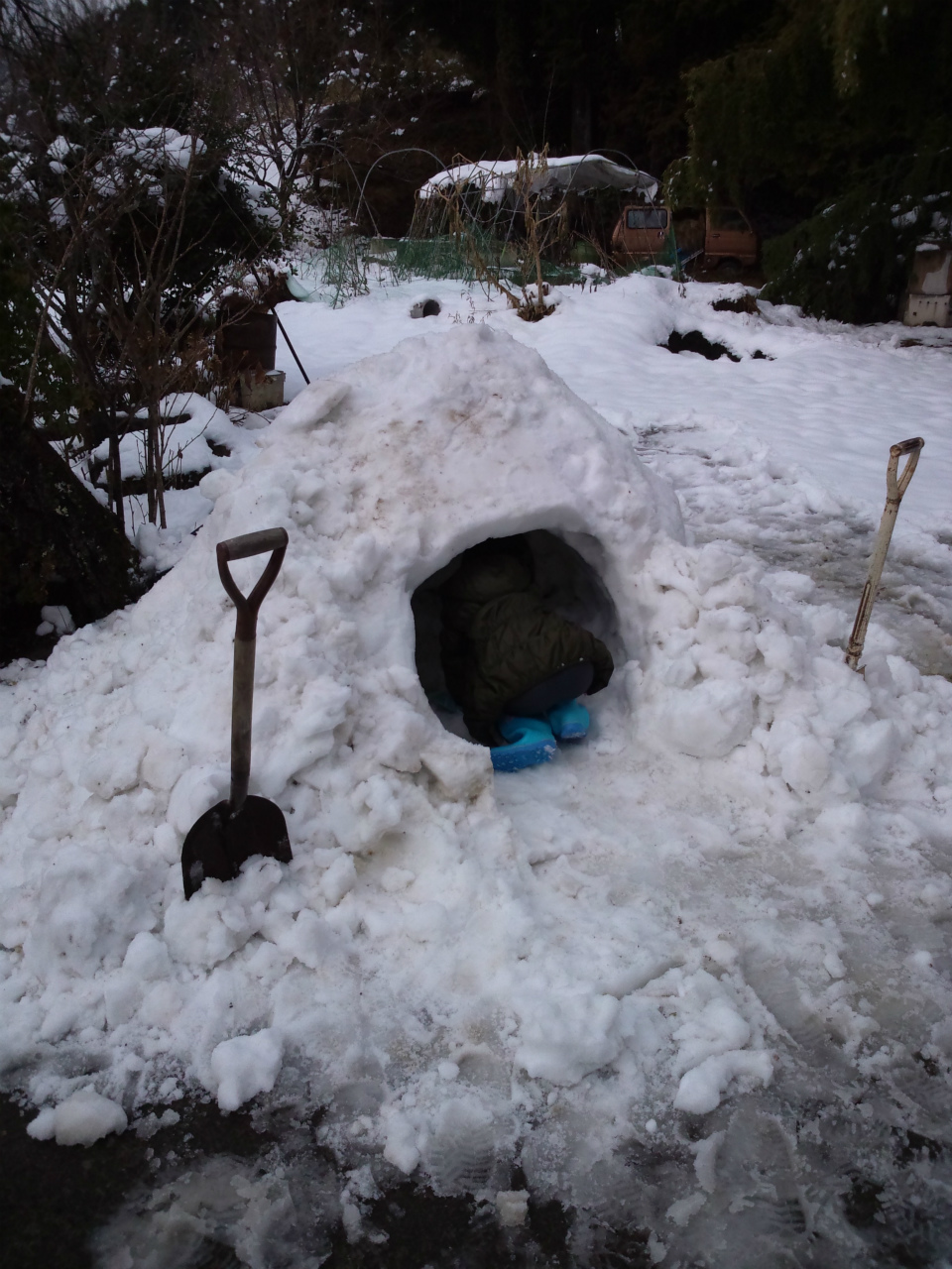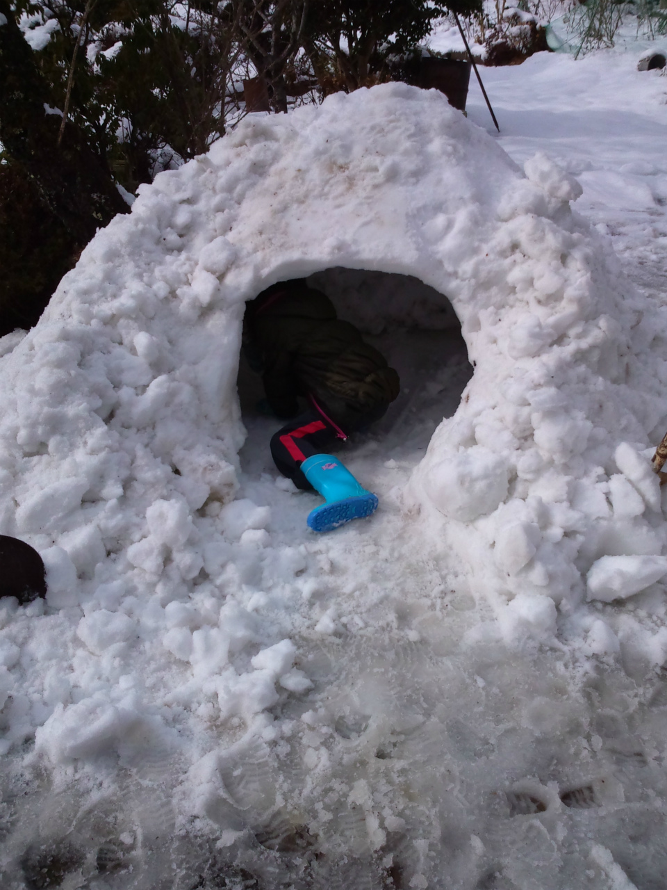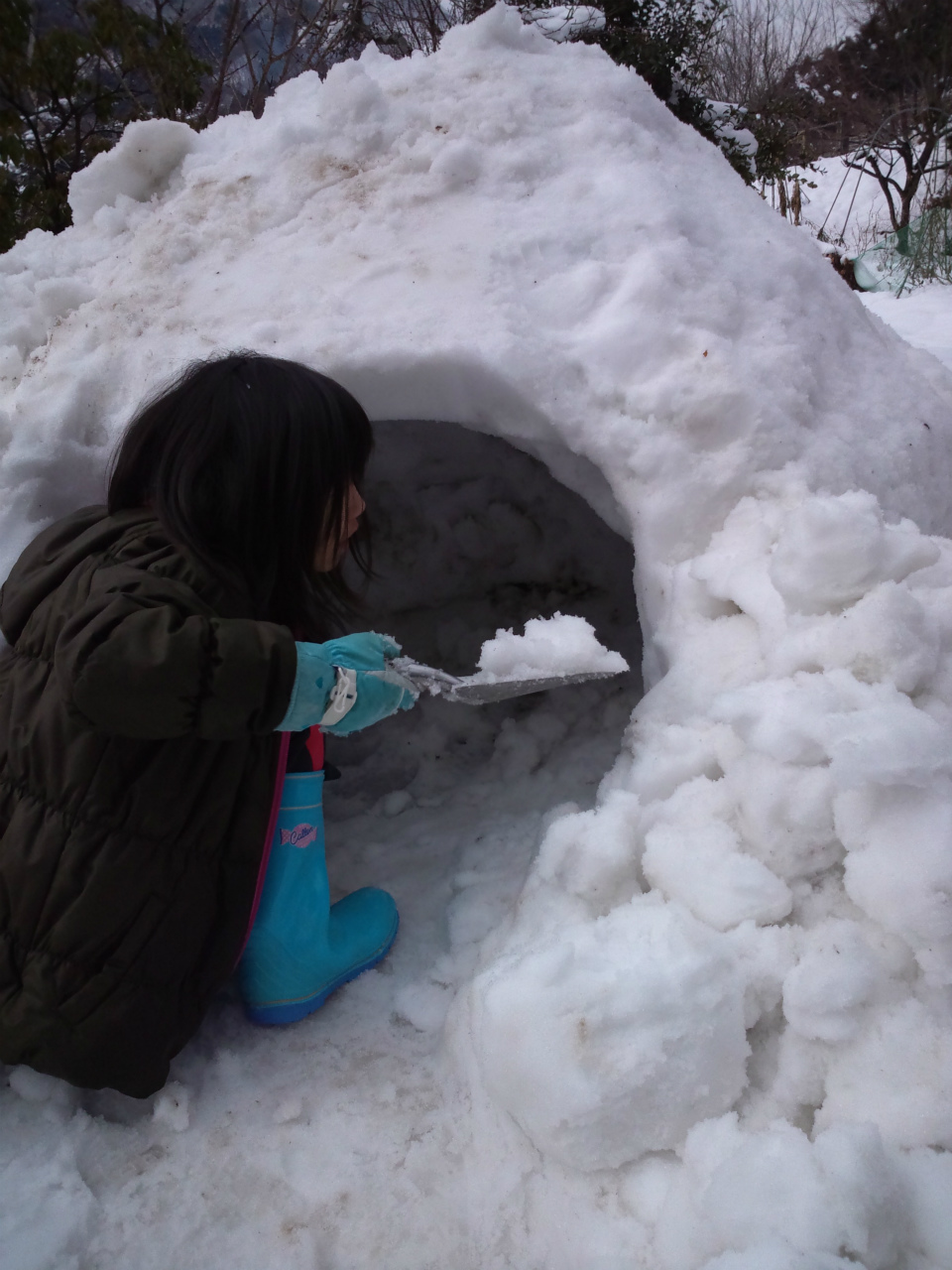 それを見て娘が「かまくらを作りたい」と言っていたので数箇所に集めおいた雪を