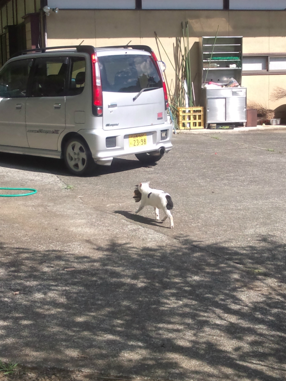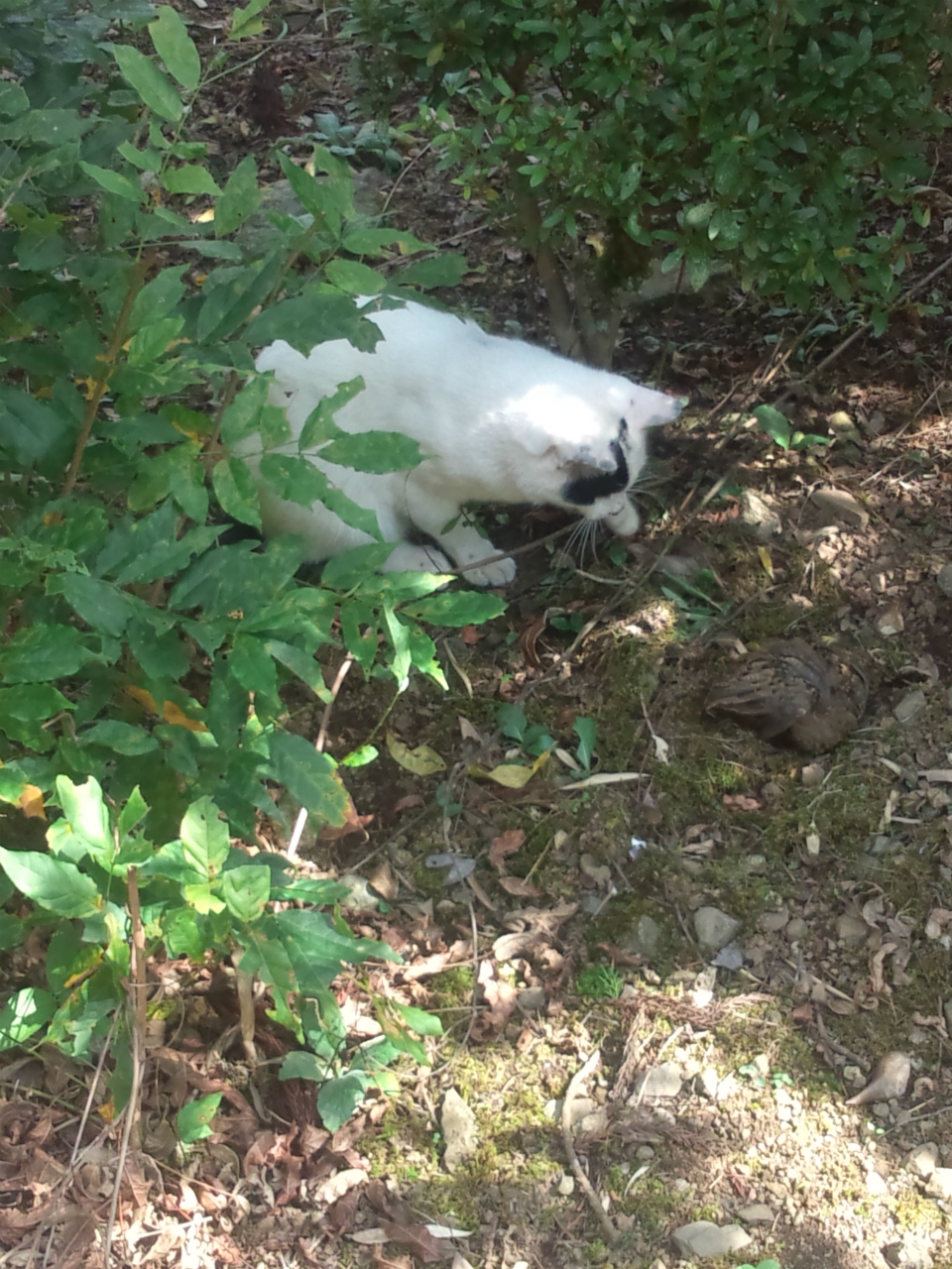 外に出て追いかけて見た所、鳥の雛をくわえていました。