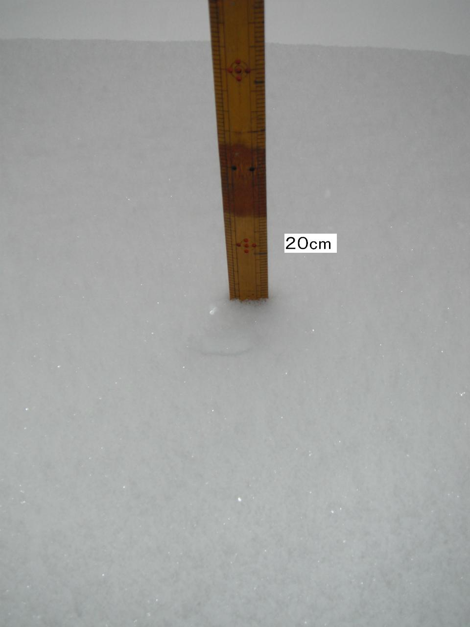 )ウッドデッキに積もった雪をものさしで測ってみました。