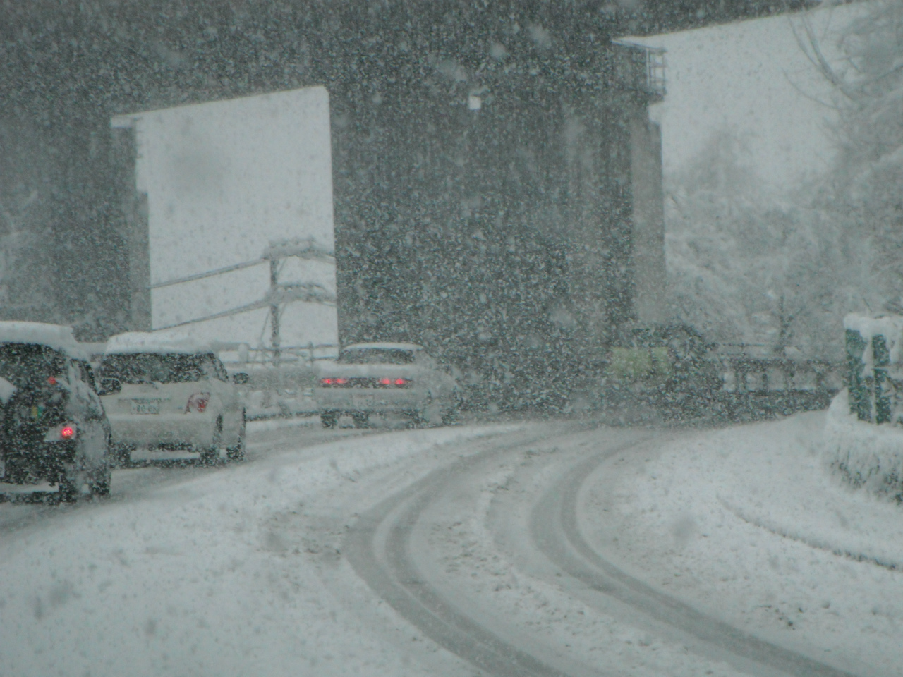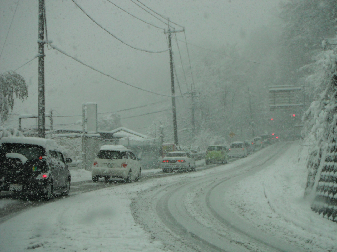 ところが、一番雪掃きの早い国道に出たとたん渋滞です。