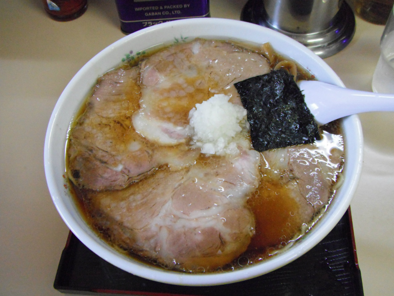 麺が見えませんけど、麺は普通の太さのストレート麺(尾張屋さん製)で、スープは鶏がらダシの醤油味、刻み玉ねぎと海苔メンマと結構柔らかめのチャーシューです。